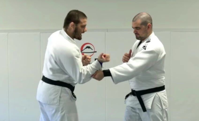 When we roll we start, consciously or otherwise, to look at our chances against our partner, in equal amounts of fear, confidence and excitement. We can start standing or sitting, it does not matter. The first thing we do is engage our partner. To instinctively reach out and get a grip on the fabric of our partner’s gi.